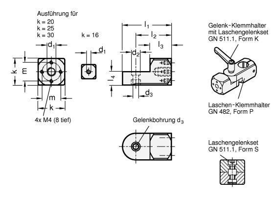 Sie lassen sich mit Laschen-Klemmhalter GN 482 sowie T-Laschen-Klemmhalter GN 483 mit gleichen k-Maßen zu Gelenk-Klemmhaltern kombinieren. Dazu stehen Laschengelenksets GN 511.1 mit Schraube Form S und verstellbarem Klemmhebel Form K zur Verfügung (Bestellbezeichnung siehe Maßtabelle).