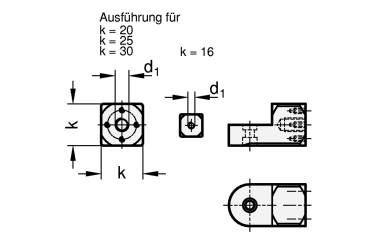 Anbau-Laschen-Klemmhalter GN 484 sind unter anderem zur Montage von Sensorhaltern GN 479 und Halteblechen GN 479.1 vorgesehen. Sie besitzen ein Zentralgewinde und ab der Größe k = 20 ein zusätzliches Bohrbild 4 x M4.