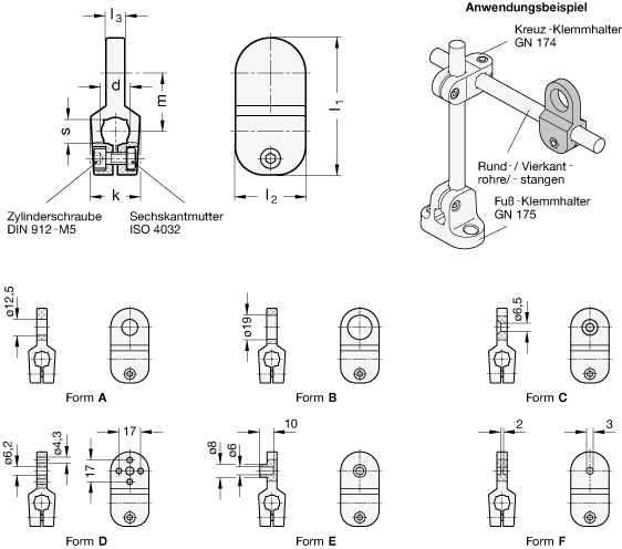 Sie werden in Verbindung mit Klemmhaltern eingesetzt und können sowohl auf Rundrohre (-stangen) als auch auf Vierkantrohre (-stangen) montiert werden. Bei letzteren wird durch Formschluss ein Verdrehen im Klemmelement verhindert.