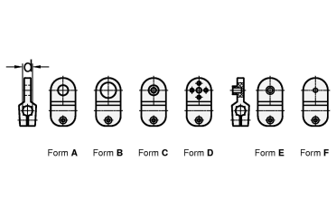 Form A für Sensorbefestigung B für Sensorbefestigung C mit Bohrung für Senkschraube M6 D für Reflektorbefestigung E für Reflektorbefestigung F zur Aufnahme spezifischer Bohrungen