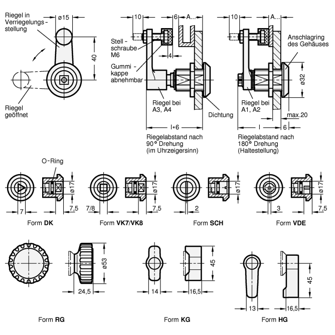 Die Dreh-Spannriegel GN 516.1 haben eine Schließmechanik, welche die Drehbewegung des Bedienelementes (Schlüssels) in eine 90°-Drehung und anschließend in einen linearen Hub des Riegels von 6 mm umsetzt.