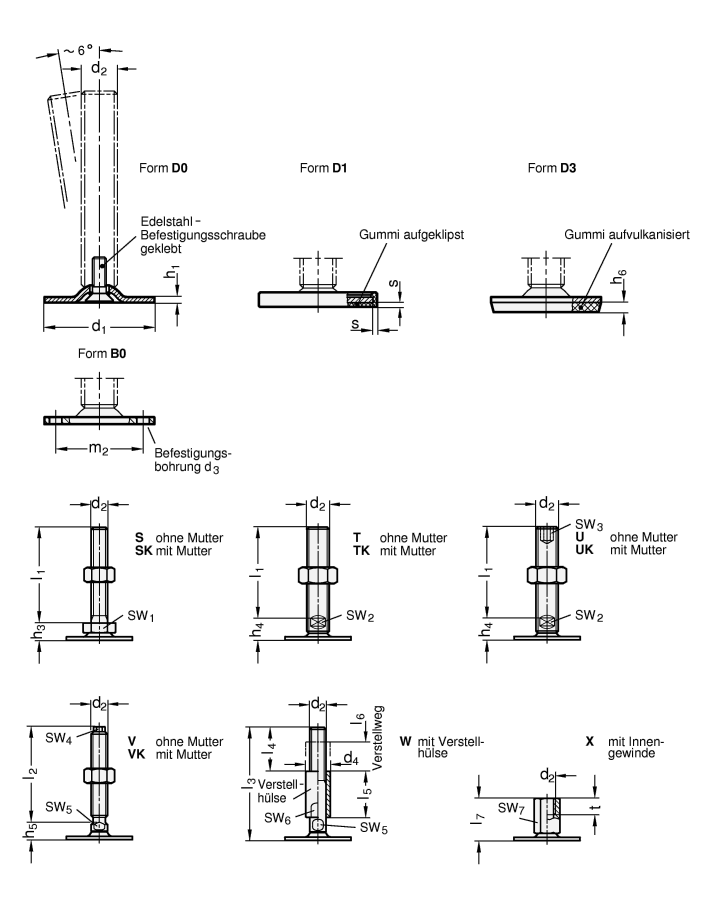 Stellfüße, Edelstahl-Blech, mit und ohne Gummiauflage >> Fußdurchmesser d1 = 80 > Gewinde d2 = M 24 > Länge l3 (W) = 209