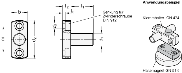 Der Bohrungsabstand m der Flanschbolzen GN 480 ist auf die Klemmhalter GN 473 und GN 477 sowie auf Haltemagnete GN 51.6 abgestimmt.
