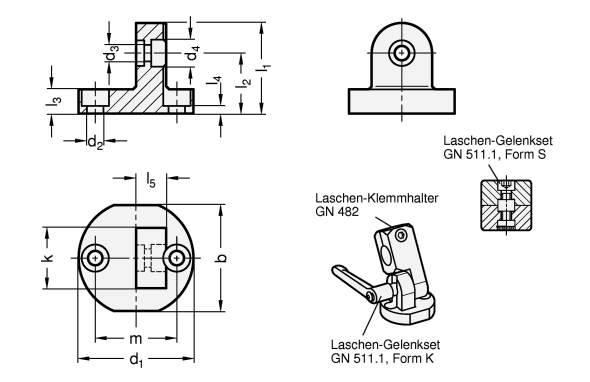 Fußlaschen-Klemmhalter GN 485 lassen sich mit Laschen-Klemmhalter GN 482, T-Laschen-Klemmhalter GN 483 sowie mit Anbau-Laschen-Klemmhalter GN 484 mit gleichen k-Maßen zu Gelenk-Klemmhaltern kombinieren. Dazu stehen Laschengelenksets GN 511.1 mit Schraube Form S und verstellbarem Klemmhebel Form K zur Verfügung (Bestellbezeichnung siehe Maßtabelle).