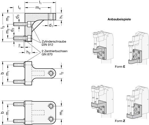 Gegenhalter für zwei Druckschrauben (Form Z) werden vorzugsweise für das verdrehsichere Spannen von Blechteilen eingesetzt. Hierzu eignen sich besonders Kugelspannschrauben GN 605.