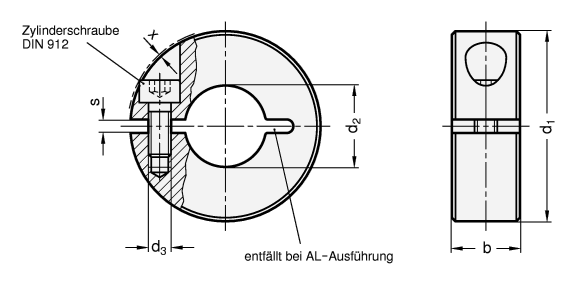 Das Gewinde d3 ist bei den Größen d1 = 20 bis 36 als Durchloch, ab Größe d1 = 42 als Sackloch ausgeführt.