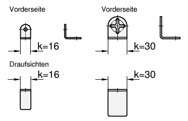 Die Befestigungsbohrung ist auf die Zentralgewinde von Anbau-Klemmhaltern GN 478 abgestimmt. Bei k=30 erlauben die kreuzförmig angeordneten Langlöcher eine zusätzliche Justierbarkeit und die Verwendung von zwei Befestigungsschrauben.