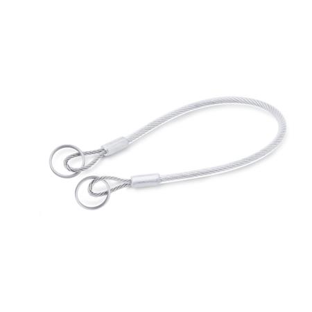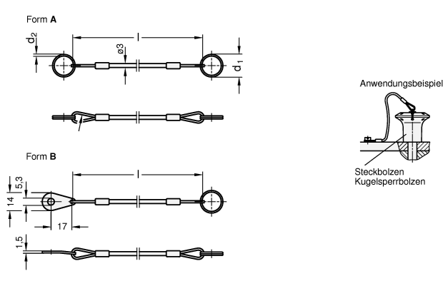 Die Schlüsselringe werden am Edelstahl-Halteseil montiert geliefert. Bei Form A besitzen beide Ringe den gleichen Durchmesser d1.