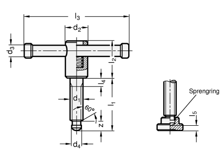 Der Druckzapfen der Knebelschrauben DIN 6306 ist so ausgebildet, dass er sowohl direkt als auch in Verbindung mit einem Druckstück zum Spannen verwendet werden kann.