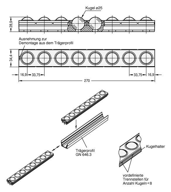 Die Kugelleiste wird vertikal in das Trägerprofil eingeklippst oder axial eingeschoben. Es sind keine Befestigungselemente erforderlich. Die Demontage kann allerdings nur axial erfolgen.