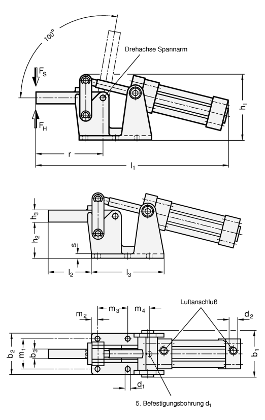 Pneumatik-Spanner GN 861 sind so konstruiert, dass sie leicht zu demontieren sind: die Lagerbolzen sind axial durch Seeger-Ringe gesichert. Der Spannarm kann so nach der Demontage entsprechend dem Anwendungsfall bearbeitet werden.