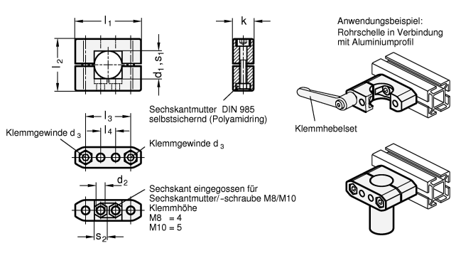 Die Klemmschrauben sind in der Standardausführung Zylinderschrauben mit Innensechskant DIN 912. Sie können durch Klemmhebelsets GN 911 ersetzt werden (Bestellbezeichnung siehe Maßtabelle).