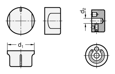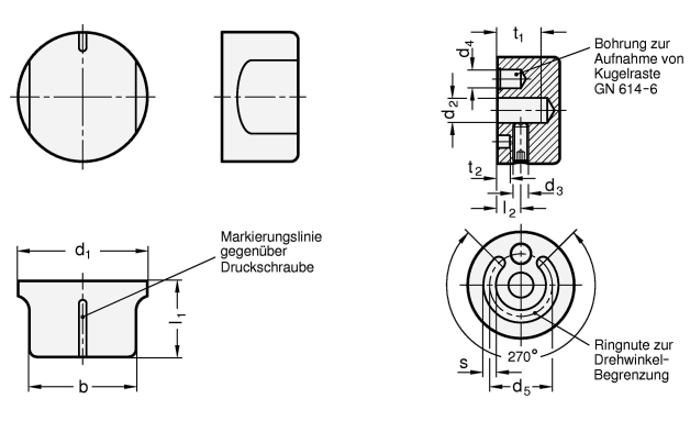 Mit Hilfe von Begrenzungsstiften, die in die Ringnute ragen, kann der Drehwinkel begrenzt werden. Die Bohrung d4 dient zur Aufnahme von federnden Druckstücken GN 614, wodurch sich auf einfache Weise Raststellungen realisieren lassen.