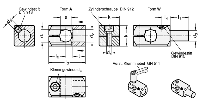 Die Klemmschraube am Klenmmgewinde d4 ist in der Standardausführung eine Zylinderschraube mit Innensechskant DIN 912. Sie kann durch einen verstellbaren Klemmhebel GN 511 ersetzt werden (Bestellbezeichnung siehe Maßtabelle).