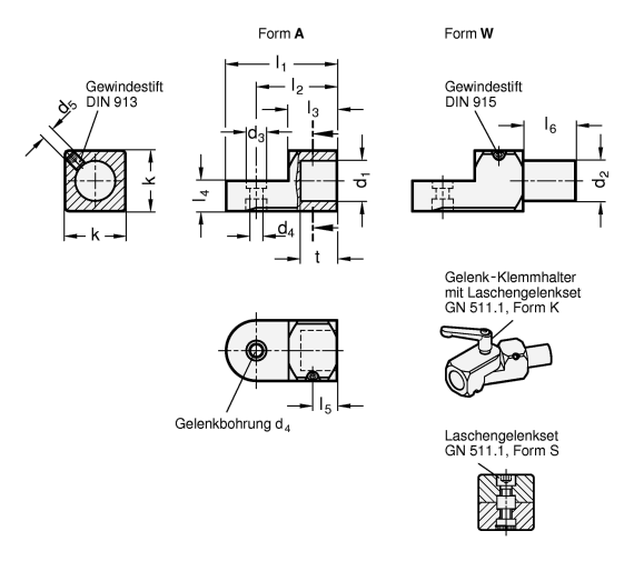 T-Laschen-Klemmhalter GN 483 lassen sich mit Laschen-Klemmhalter GN 482 sowie Anbau-Laschen-Klemmhalter GN 484 mit gleichen k-Maßen zu Gelenk-Klemmhaltern kombinieren. Dazu stehen Laschengelenksets GN 511.1 mit Schraube, Form S und verstellbarem Klemmhebel, Form K zur Verfügung (Bestellbezeichnung siehe Maßtabelle).