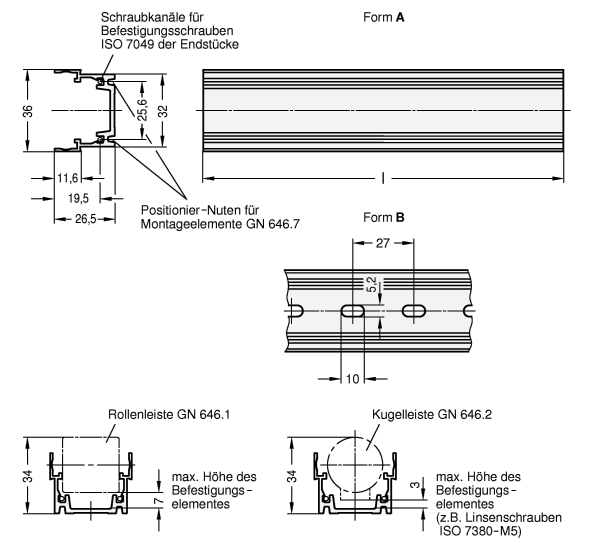 Trägerprofile GN 646.3 bilden die Grundkörper für Rollen- und Kugelleisten. Sie sind Träger für die Rollenleisten GN 646.1 und die Kugelleisten GN 646.2 und zeichnen sich durch eine hohe Steifigkeit aus.