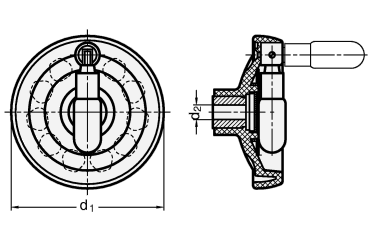 Bei diesen Handrädern ist der Griff in der Bedienstellung arretiert. Zum Umlegen muss er zunächst in Achsrichtung aus dem Konus gezogen werden.