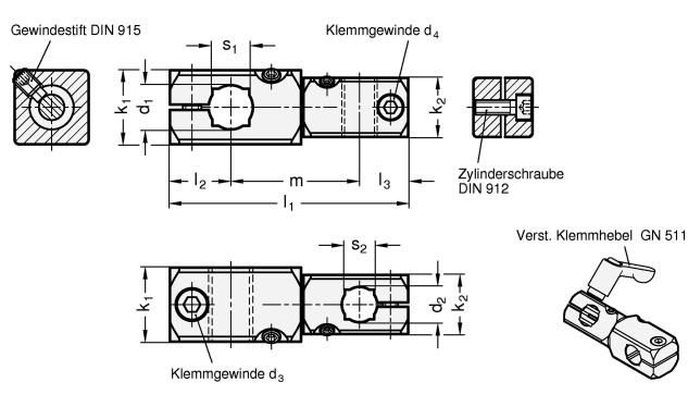 Die Klemmschrauben der Klemmgewinde d3 / d4 sind in der Standardausführung Zylinderschrauben mit Innensechskant DIN 912. Sie können durch einen verstellbaren Klemmhebel GN 511 ersetzt werden (Bestellbezeichnung siehe Maßtabelle).
