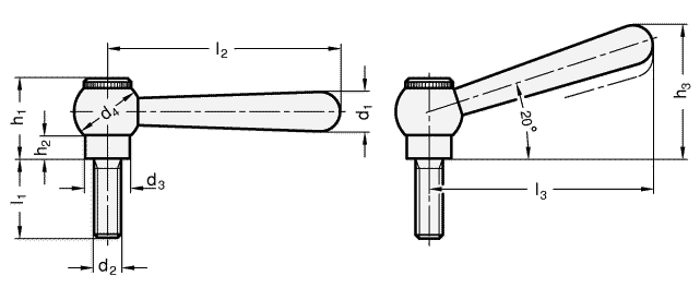 Wie alle verstellbaren Hebel sind sie dann einzusetzen, wenn der Spannbereich begrenzt oder eine bestimmte Spannstellung erwünscht ist. In der Kugelbohrung befindet sich der Schraubeneinsatz, der durch eine Kerbverzahnung mit dem Griff lösbar verbunden ist.