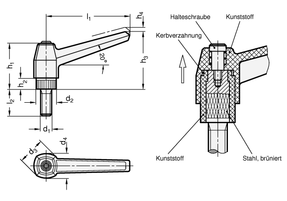 Durch Anheben (Ziehen) des Griffes wird die Kerbverzahnung frei und der Klemmhebel kann in die günstigste Spannposition geschwenkt werden. Beim ,,Loslassen’’ rastet der Griff selbsttätig wieder ein.