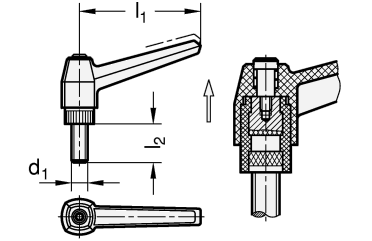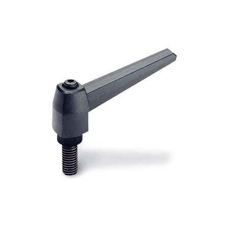 Verstellbare Klemmhebel GN 500 sind vorzugsweise dann einzusetzen, wenn der Spannbereich begrenzt oder eine bestimmte Spannstellung erwünscht ist. Der Gewindeeinsatz ist durch eine Kerbverzahnung mit dem Griff lösbar verbunden.