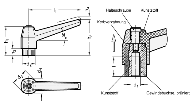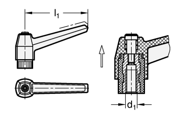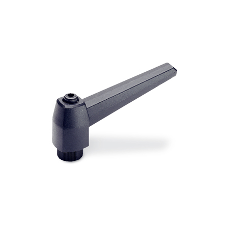 Verstellbare Klemmhebel GN 500 sind vorzugsweise dann einzusetzen, wenn der Spannbereich begrenzt oder eine bestimmte Spannstellung erwünscht ist. Der Gewindeeinsatz ist durch eine Kerbverzahnung mit dem Griff lösbar verbunden.