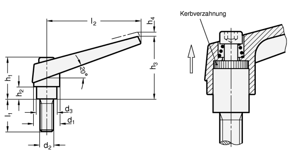 Durch Anheben (Ziehen) des Griffes wird die Kerbverzahnung frei und der Klemmhebel kann in die günstigste Spannposition geschwenkt werden. Beim ,,Loslassen’’ rastet der Griff selbsttätig wieder ein.