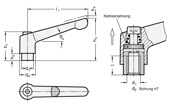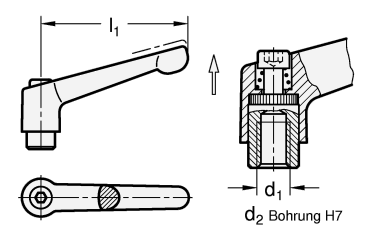 Durch Anheben (Ziehen) des Griffes wird die Kerbverzahnung frei und der Klemmhebel kann in die günstigste Spannposition geschwenkt werden. Beim "Loslassen" rastet der Griff selbsttätig wieder ein.